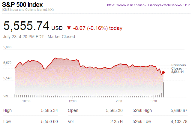 On a day of variable movements, major stock indices closed with tiny to large mixed amounts. The Dow Jones Industrial Average (DJIA) was up 0.59% to 41,335.05 (a record high close, the first close over 41,300), with a record intraday high of 41,557.97 (the first high over 41,400 and 41,500); while the Standard & Poor’s 500 stock index was down 0.00% to 5,591.96. The NASDAQ Composite index was down 0.23% to 17,516.43. ![]() |