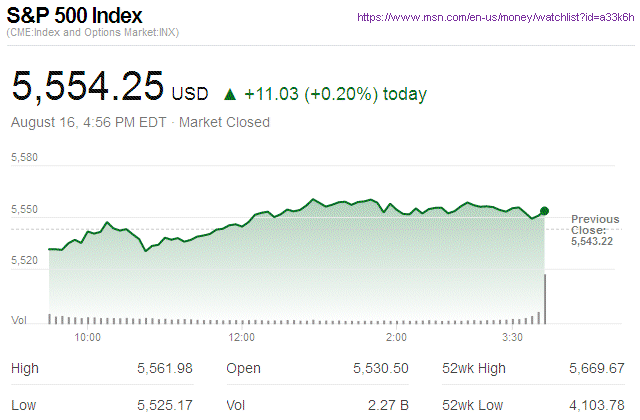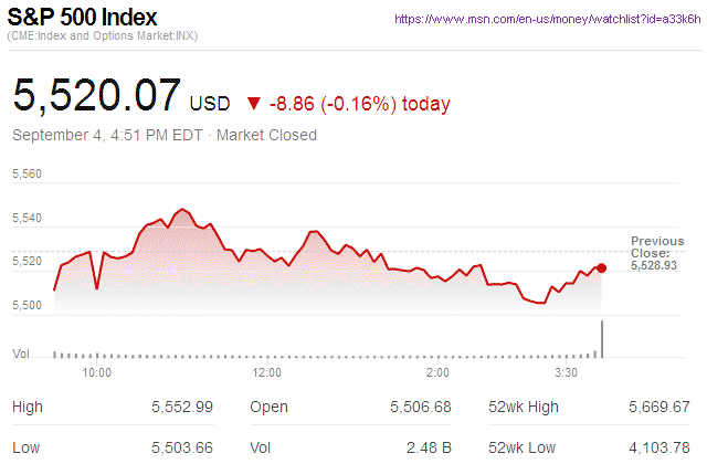Following yesterday’s substantial market declines, major stock indices closed today with very small to small mixed amounts. The Dow Jones Industrial Average (DJIA) was up 0.09% to 40,974.97, while the Standard & Poor’s 500 stock index was down 0.16% to 5,520.07. The NASDAQ Composite index was down 0.30% to 17,084.30. ![]() |