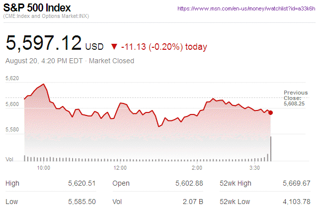 After notable “zigging” and “zagging” throughout the trading day, major stock indices closed with very small to small losses. The Dow Jones Industrial Average (DJIA) was down 0.15% to 40,834.97, while the Standard & Poor’s 500 stock index was down 0.20% to 5,597.12. The NASDAQ Composite index was down 0.33% to 17,816.94. ![]() |