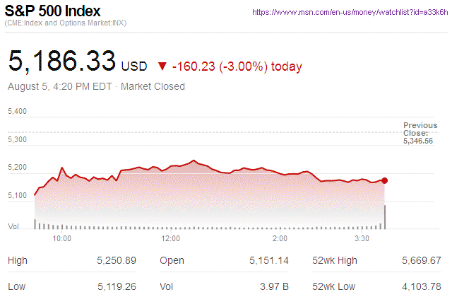 On a very significant global market sell-off day, major stock indices closed with very large to huge losses. The Dow Jones Industrial Average (DJIA) was down 2.60% to 38,703.27, while the Standard & Poor’s 500 stock index was down 3.00% to 5,186.33. The NASDAQ Composite index was down 3.43% to 16,200.08. ![]() |