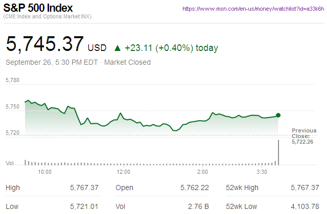 In another widespread positive trading day, major stock indices closed the day with tiny to large gains. The Dow Jones Industrial Average (DJIA) was up 0.61% to 40,008.39, while the Standard & Poor’s 500 stock index was up 0.38% to 5,455.21. The NASDAQ Composite index was up 0.03% to 17,192.60. ![]() |