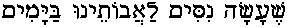 | Barukh atah Adonai, Eloheinu, melekh ha‘olam she‘asah nisim la‘avoteinu bayamim haheim baziman hazeh. (Amein) Who performed miracles for our ancestors in those days, at this season. (Amen) |